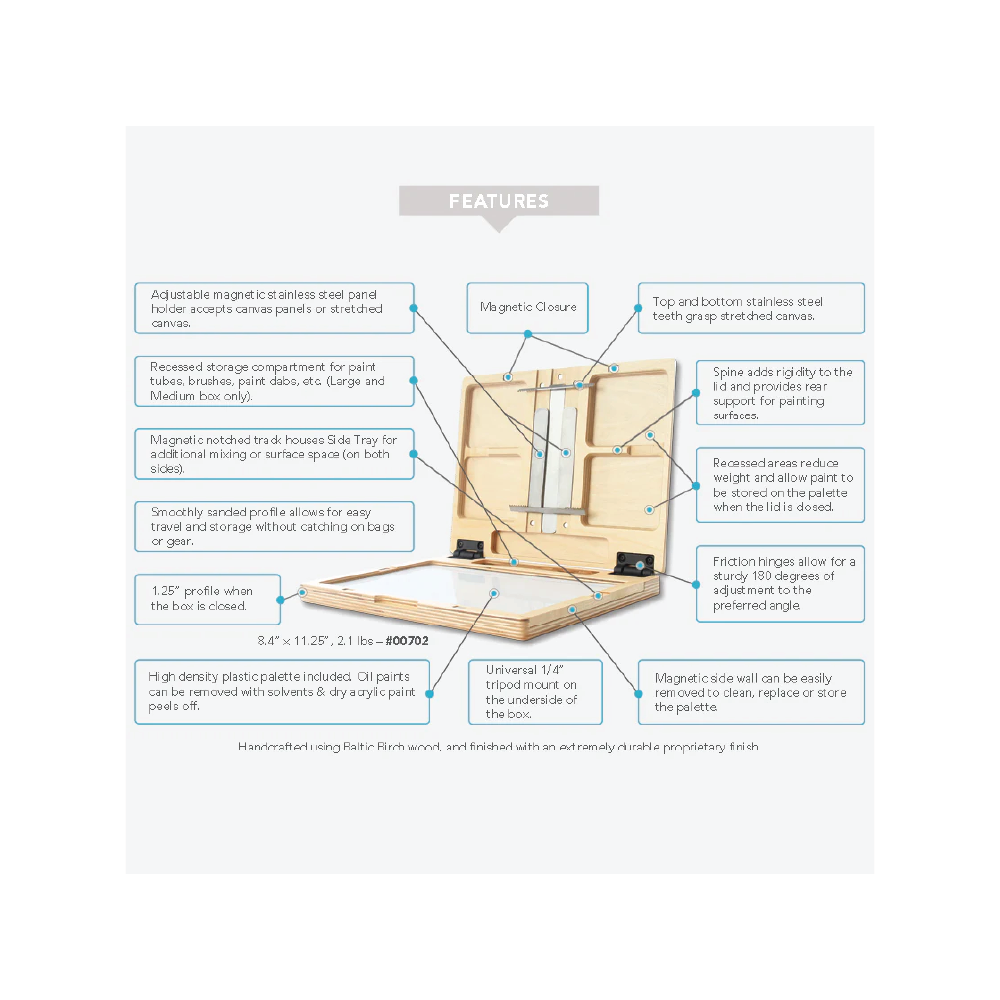 Size/Weight: Measuring 8.4″x11.25″x1.25,” the mid-size model (Item #00702) is ultra lightweight at 2.1 lbs, with palette included.